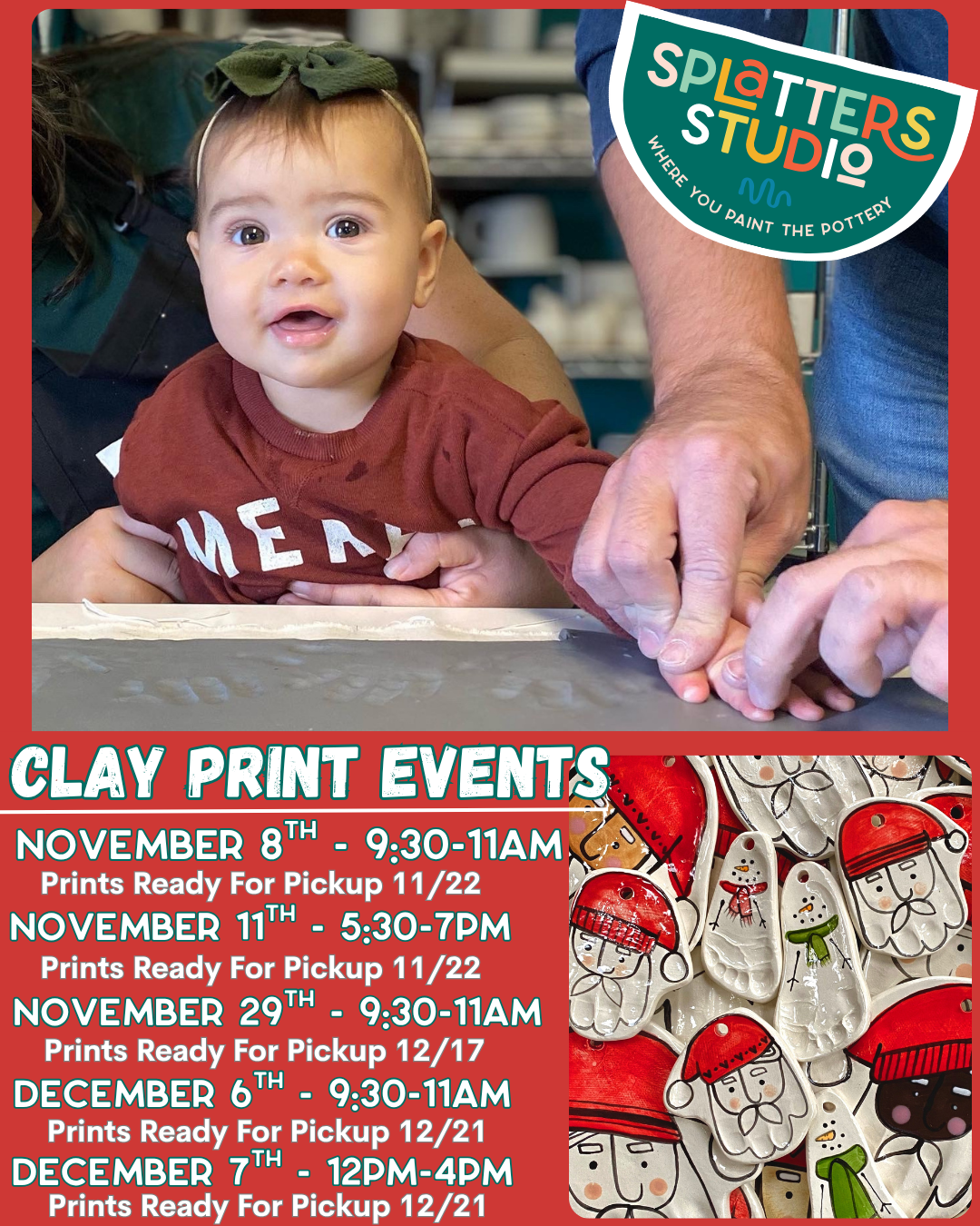 clay prints create a memory of those sweet little handprint and footprints at a moment in time. Events are walk in, no reservations are needed, All ages are welcome. prints are custom painted by us at splatters. Each print is $22